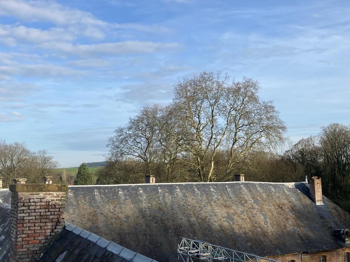 Lors de l’acquisition de l’Abbaye en 2019, un “repiquage” complet (remplacement des ardoises fuyardes) a été effectué afin de parer aux plus urgent et stopper les infiltrations innombrables qui détérioraient les charpentes, planchers et décors intérieurs.
